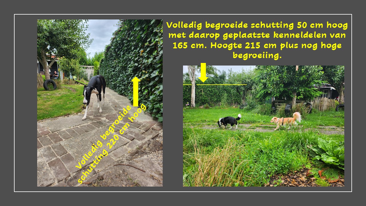 De omheining is overal minimaal 215 centimeter hoog, of hoger en langs de schutting en de kenneldelen ligt 70 cm gaas in de bodem en/of een brede rij zware betontegels en boomstammen.