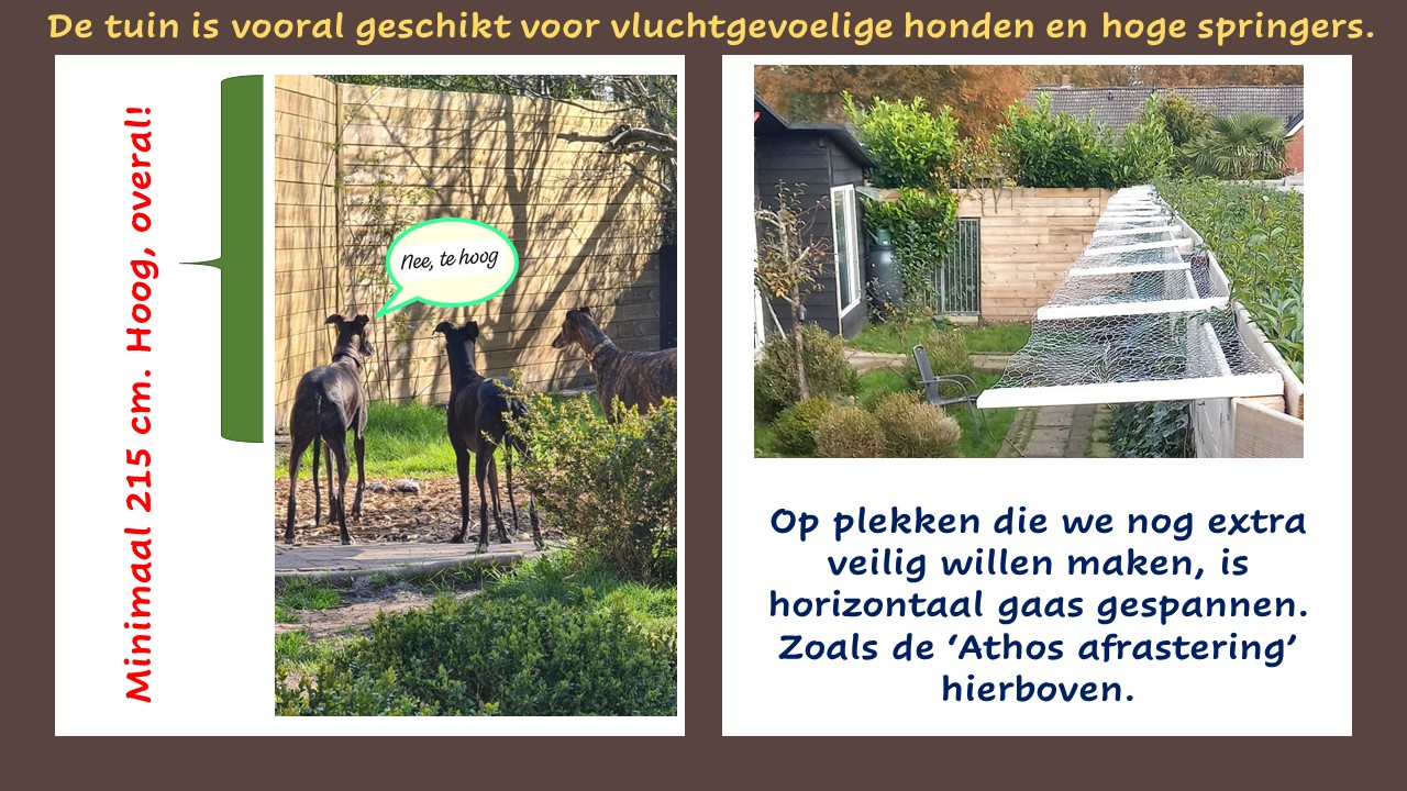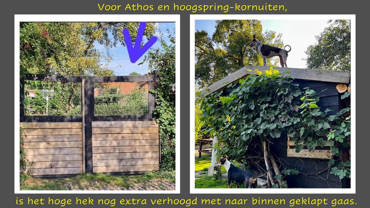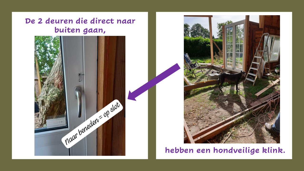 De aangrenzende snuffeltuin is minimaal 180 hoog omheind maar niet ‘hele kleine hondjes proof’, dus die liever aan de lijn of een rugzakje om als ze ontsnappingsgevoelig zijn en door schapengaas kunnen. We vinden het fijn om eerst even met elkaar zonder de honden, door onze tuin te lopen zodat je kunt bekijken of deze tuin veilig genoeg is voor jouw honden.
