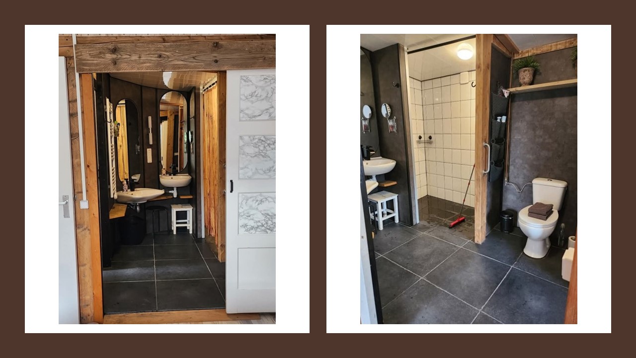 De badkamer is ruim, heeft 2 wastafels, een ruime douche, is volledig rolstoelgeschikt en grenst aan de grote slaapkamer. Bij aankomst liggen er altijd 2 schone douchematjes klaar.