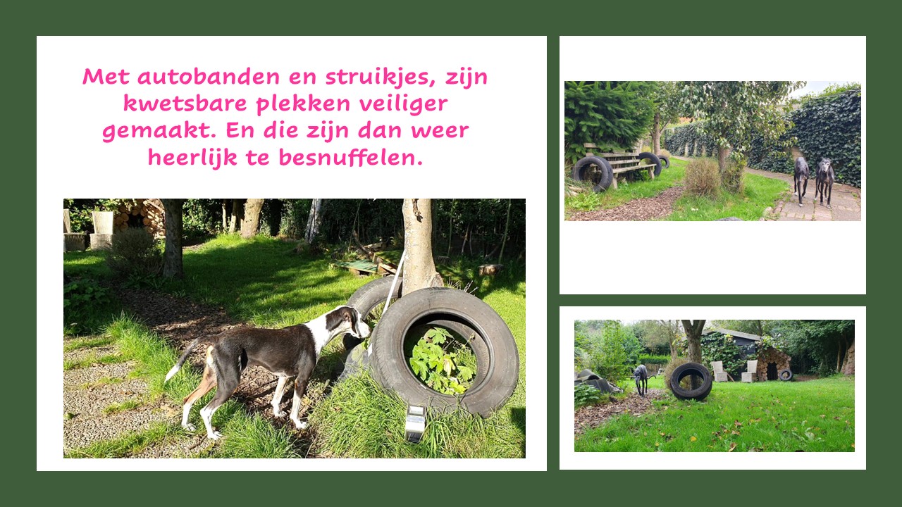 Er is veel verschillend materiaal voor onder de pootjes. Gras, boomschors, houtsnippers, dennenappels, boomstammen, takken en hout op de grond, verschillende soorten tegels, aarde, zand, 2 soorten kunstgras op verhogingen en natuurlijk water. Op het snuffel-speelveld laten we het gras bewust hoger staan en maaien alleen wat graspaadjes.