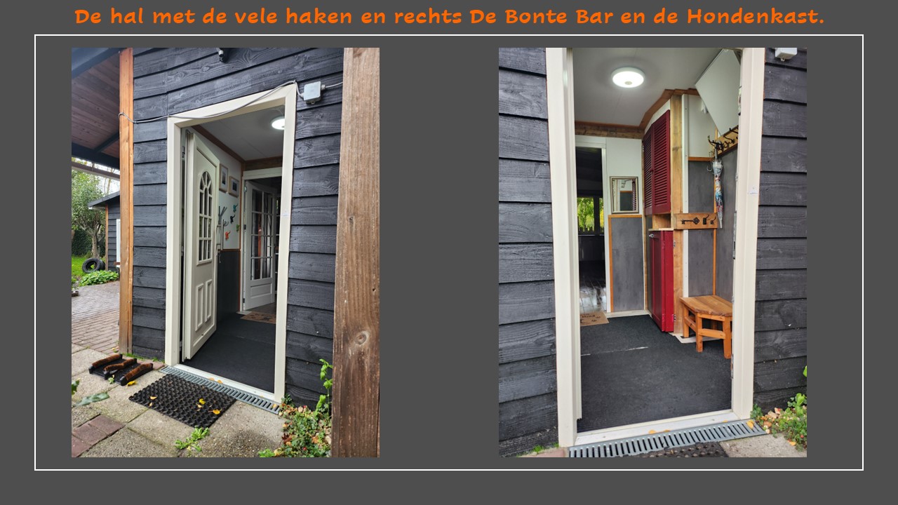 Er is een ruime hal met voldoende ruimte voor riemen, tuigen, schoenen, jassen, laarzen ed. In de hal bevindt zich ook de hondenkast. En sinds oktober 2025 heeft ‘De Bonte Bar’ hier ook een plekje gekregen. Een kleine kast met levensmiddelen en lekkernijen. Vanaf de parkeerplaats is de hal bereikbaar via een tegel-rolstoelvriendelijk pad.