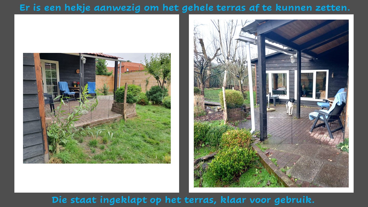 Het terras is deels overdekt en heeft een tafel, stoelen en 2 parasols. Het terras is met een laag hekje af te sluiten voor kleine hondjes.