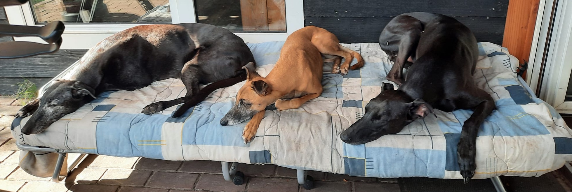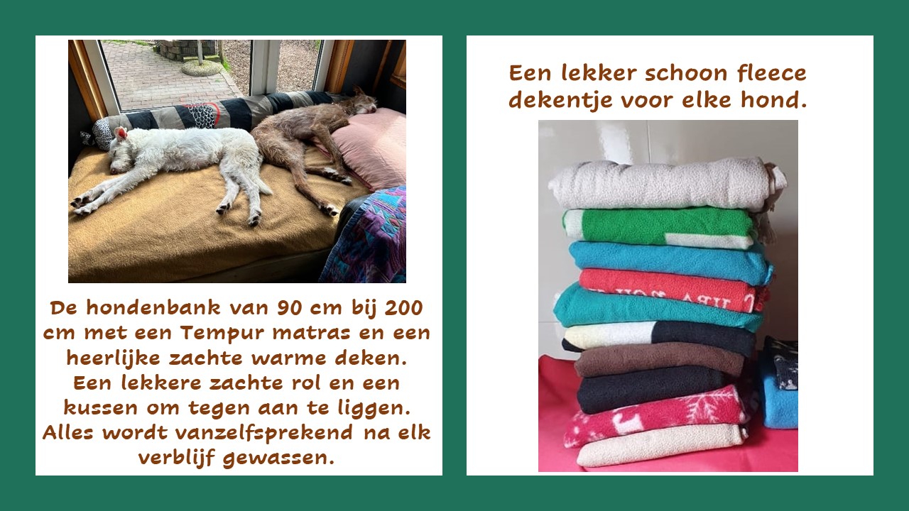 - De 2 hondenopklapbedden voor buiten. Graag wel een kleed of deken erover zodat de matrassen schoon kunnen blijven.