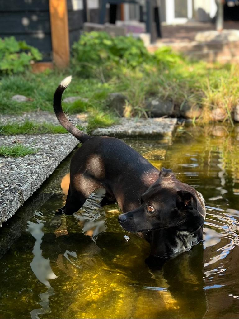 De kleine pootjebaai vijver met waterstroompje is voor alle honden een leuk maar soms ook spannend plekje.