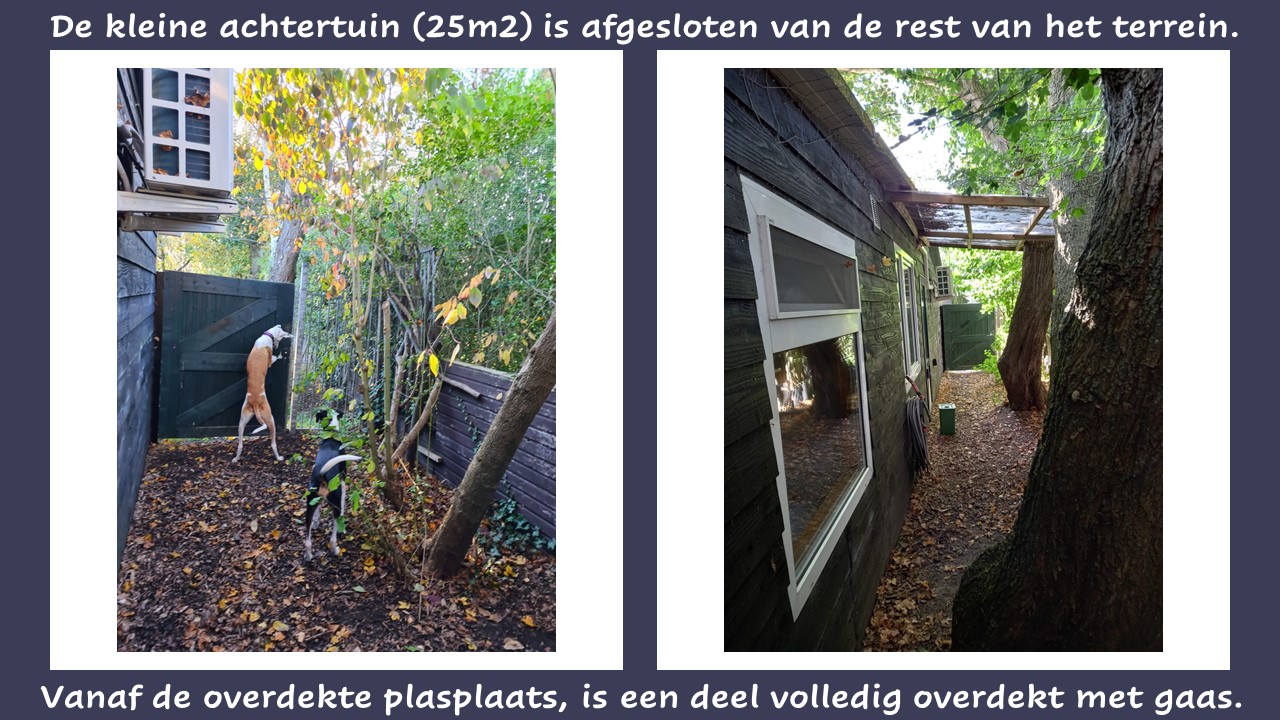 In overleg en op afspraak tijdens het verblijf, kun je dagelijks via de kleine poort naar de aangrenzende snuffel-rentuin, voor 850 m2 extra plezier met weer nieuwe geurtjes en ruimte. De snuffeltuin is dan privé voor jullie en jullie honden en bereikbaar via 2 poorten.