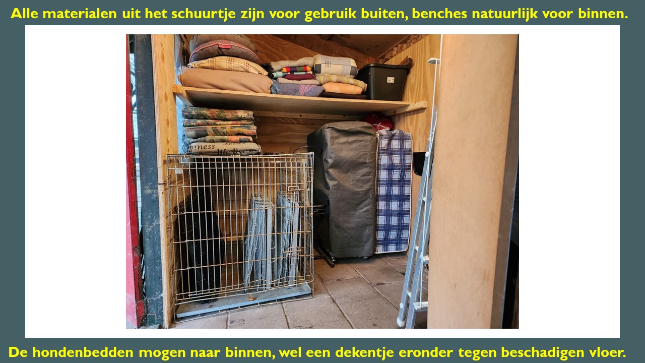 - Kleden en oude stoelkussens. Al het ligmateriaal wat in het schuurtje staat, is voor gebruik buiten.
